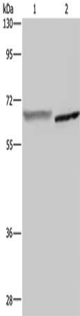 Gel: 8%SDS-PAGE, Lysate: 40 μg, Lane 1-2: Human placenta tissue, mouse liver tissue, Primary antibody: CSB-PA295309(GCKR Antibody) at dilution 1/400, Secondary antibody: Goat anti rabbit IgG at 1/8000 dilution, Exposure time: 2 minutes