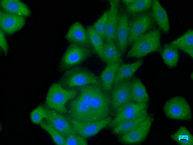 Immunofluorescence staining of HepG2 cells with CSB-PA868295NA01HU at 1:50, counter-stained with DAPI. The cells were fixed in 4% formaldehyde, permeabilized using 0.2% Triton X-100 and blocked in 10% normal Goat Serum. The cells were then incubated with the antibody overnight at 4°C. The secondary antibody was Alexa Fluor 488-congugated AffiniPure Goat Anti-Rabbit IgG(H+L).