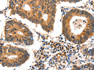 The image on the left is immunohistochemistry of paraffin-embedded Human colon cancer tissue using CSB-PA294342(GDF6 Antibody) at dilution 1/25, on the right is treated with synthetic peptide. (Original magnification: ×200)