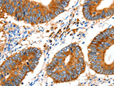 The image on the left is immunohistochemistry of paraffin-embedded Human colon cancer tissue using CSB-PA245851(GDF6 Antibody) at dilution 1/20, on the right is treated with synthetic peptide. (Original magnification: ×200)