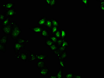 Immunofluorescence staining of Hela cells with CSB-PA021329LA01HU at 1:100, counter-stained with DAPI. The cells were fixed in 4% formaldehyde, permeabilized using 0.2% Triton X-100 and blocked in 10% normal Goat Serum. The cells were then incubated with the antibody overnight at 4°C. The secondary antibody was Alexa Fluor 488-congugated AffiniPure Goat Anti-Rabbit IgG(H+L).