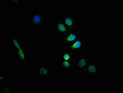 Immunofluorescence staining of A549 cells with CSB-PA009369LA01HU at 1:66, counter-stained with DAPI. The cells were fixed in 4% formaldehyde, permeabilized using 0.2% Triton X-100 and blocked in 10% normal Goat Serum. The cells were then incubated with the antibody overnight at 4°C. The secondary antibody was Alexa Fluor 488-congugated AffiniPure Goat Anti-Rabbit IgG(H+L).