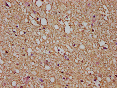 IHC image of CSB-PA009369LA01HU diluted at 1:200 and staining in paraffin-embedded human glioma performed on a Leica BondTM system. After dewaxing and hydration, antigen retrieval was mediated by high pressure in a citrate buffer (pH 6.0). Section was blocked with 10% normal goat serum 30min at RT. Then primary antibody (1% BSA) was incubated at 4°C overnight. The primary is detected by a biotinylated secondary antibody and visualized using an HRP conjugated SP system.