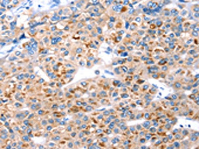The image on the left is immunohistochemistry of paraffin-embedded Human liver cancer tissue using CSB-PA037992(GFRA3 Antibody) at dilution 1/20, on the right is treated with synthetic peptide. (Original magnification: ×200)