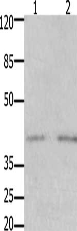 Gel: 10%SDS-PAGE, Lysate: 40 μg, Lane 1-2: Human fetal kidney tissue, Human brain tissue, Primary antibody: CSB-PA037992(GFRA3 Antibody) at dilution 1/1000, Secondary antibody: Goat anti rabbit IgG at 1/8000 dilution, Exposure time: 5 minutes