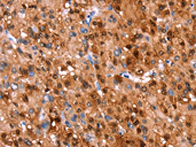The image on the left is immunohistochemistry of paraffin-embedded Human liver cancer tissue using CSB-PA576969(GH1 Antibody) at dilution 1/40, on the right is treated with synthetic peptide. (Original magnification: ×200)