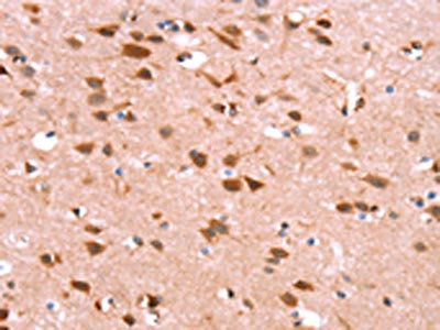 The image on the left is immunohistochemistry of paraffin-embedded Human brain tissue using CSB-PA576969(GH1 Antibody) at dilution 1/40, on the right is treated with synthetic peptide. (Original magnification: ×200)