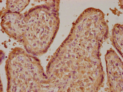 IHC image of CSB-PA009407LA01HU diluted at 1:100 and staining in paraffin-embedded human placenta tissue performed on a Leica BondTM system. After dewaxing and hydration, antigen retrieval was mediated by high pressure in a citrate buffer (pH 6.0). Section was blocked with 10% normal goat serum 30min at RT. Then primary antibody (1% BSA) was incubated at 4°C overnight. The primary is detected by a biotinylated secondary antibody and visualized using an HRP conjugated SP system.