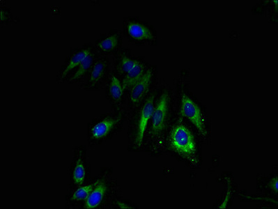 Immunofluorescence staining of Hela cell with CSB-PA009453LA01HU at 1:30, counter-stained with DAPI. The cells were fixed in 4% formaldehyde and blocked in 10% normal Goat Serum. The cells were then incubated with the antibody overnight at 4C. The secondary antibody was Alexa Fluor 488-congugated AffiniPure Goat Anti-Rabbit IgG(H+L).