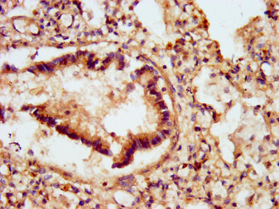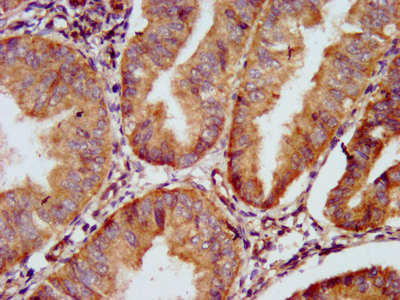 IHC image of CSB-PA891536LA01HU diluted at 1:500 and staining in paraffin-embedded human endometrial cancer performed on a Leica BondTM system. After dewaxing and hydration, antigen retrieval was mediated by high pressure in a citrate buffer (pH 6.0). Section was blocked with 10% normal goat serum 30min at RT. Then primary antibody (1% BSA) was incubated at 4°C overnight. The primary is detected by a biotinylated secondary antibody and visualized using an HRP conjugated SP system.