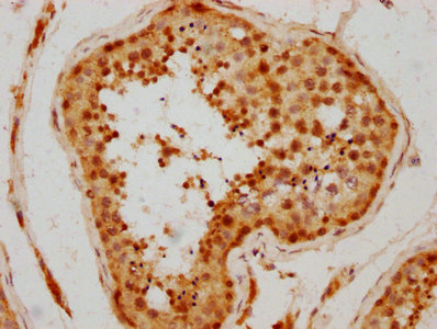 IHC image of CSB-PA009502LA01HU diluted at 1:300 and staining in paraffin-embedded human testis tissue performed on a Leica BondTM system. After dewaxing and hydration, antigen retrieval was mediated by high pressure in a citrate buffer (pH 6.0). Section was blocked with 10% normal goat serum 30min at RT. Then primary antibody (1% BSA) was incubated at 4°C overnight. The primary is detected by a biotinylated secondary antibody and visualized using an HRP conjugated SP system.
