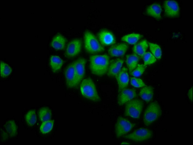 Immunofluorescence staining of Hela cells with CSB-PA009520LA01HU at 1:200, counter-stained with DAPI. The cells were fixed in 4% formaldehyde, permeabilized using 0.2% Triton X-100 and blocked in 10% normal Goat Serum. The cells were then incubated with the antibody overnight at 4°C. The secondary antibody was Alexa Fluor 488-congugated AffiniPure Goat Anti-Rabbit IgG(H+L).
