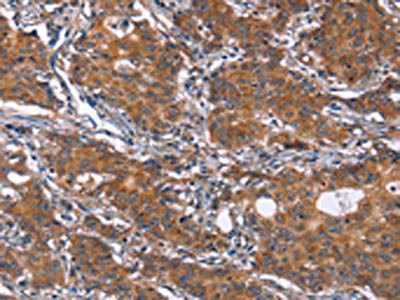 The image on the left is immunohistochemistry of paraffin-embedded Human gastic cancer tissue using CSB-PA969762(GLS Antibody) at dilution 1/25, on the right is treated with synthetic peptide. (Original magnification: ×200)