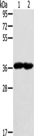 Gel: 8%SDS-PAGE, Lysate: 40 μg, Lane 1-2: Mouse heart tissue, Mouse muscle tissue, Primary antibody: CSB-PA693151(GNAT3 Antibody) at dilution 1/400, Secondary antibody: Goat anti rabbit IgG at 1/8000 dilution, Exposure time: 1 minute