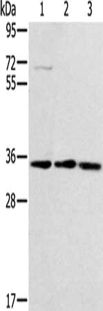 Gel: 8%SDS-PAGE, Lysate: 40 μg, Lane 1-3: Hepg2 cells, NIH/3T3 cells, Jurkat cells, Primary antibody: CSB-PA106951(GNB2L1 Antibody) at dilution 1/300, Secondary antibody: Goat anti rabbit IgG at 1/8000 dilution, Exposure time: 1 minute