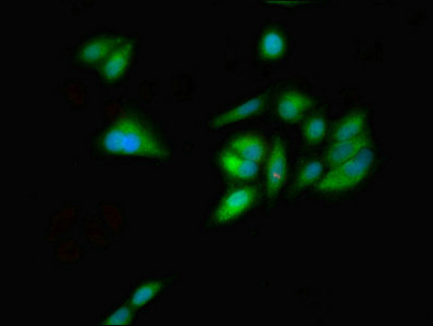 Immunofluorescent analysis of Hela cells using CSB-PA009623LA01HU at dilution of 1:100 and Alexa Fluor 488-congugated AffiniPure Goat Anti-Rabbit IgG(H+L)