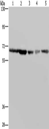 Gel: 6%SDS-PAGE, Lysate: 40 μg, Lane 1-5: K562 cells, Hela cells, LoVo cells, 293T cells, Raji cells, Primary antibody: CSB-PA206311(GNL3 Antibody) at dilution 1/300, Secondary antibody: Goat anti rabbit IgG at 1/8000 dilution, Exposure time: 5 seconds