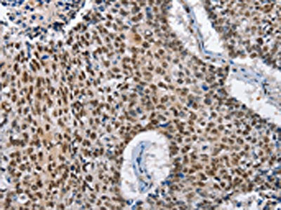 The image on the left is immunohistochemistry of paraffin-embedded Human colon cancer tissue using CSB-PA199057(GNRH1 Antibody) at dilution 1/65, on the right is treated with fusion protein. (Original magnification: ×200)