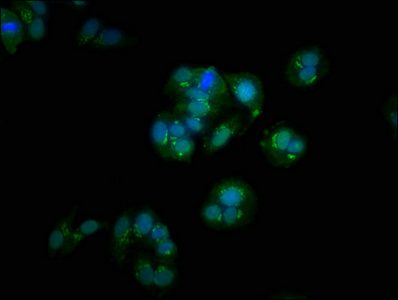 Immunofluorescence staining of HepG2 cells with CSB-PA622788LA01HU at 1:100, counter-stained with DAPI. The cells were fixed in 4% formaldehyde, permeabilized using 0.2% Triton X-100 and blocked in 10% normal Goat Serum. The cells were then incubated with the antibody overnight at 4°C. The secondary antibody was Alexa Fluor 488-congugated AffiniPure Goat Anti-Rabbit IgG(H+L).