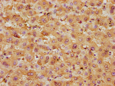 IHC image of CSB-PA009679HA01HU diluted at 1:250 and staining in paraffin-embedded human liver tissue performed on a Leica BondTM system. After dewaxing and hydration, antigen retrieval was mediated by high pressure in a citrate buffer (pH 6.0). Section was blocked with 10% normal goat serum 30min at RT. Then primary antibody (1% BSA) was incubated at 4°C overnight. The primary is detected by a biotinylated secondary antibody and visualized using an HRP conjugated SP system.