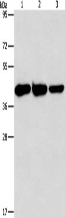 Gel: 15%SDS-PAGE, Lysate: 40 μg, Lane 1-3: Human normal liver tissue, mouse brain tissue, Mouse heart tissue, Primary antibody: CSB-PA274065(GOT1 Antibody) at dilution 1/1600, Secondary antibody: Goat anti rabbit IgG at 1/8000 dilution, Exposure time: 5 seconds