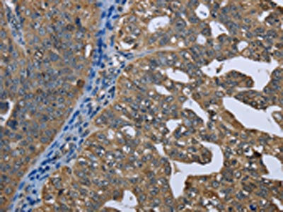 The image on the left is immunohistochemistry of paraffin-embedded Human ovarian cancer tissue using CSB-PA010968(GPAM Antibody) at dilution 1/60, on the right is treated with fusion protein. (Original magnification: ×200)