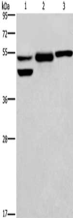 Gel: 8%SDS-PAGE, Lysate: 40 μg, Lane 1-3: Human placenta tissue, HepG2 cells, A549 cells, Primary antibody: CSB-PA934518(GPER1 Antibody) at dilution 1/350, Secondary antibody: Goat anti rabbit IgG at 1/8000 dilution, Exposure time: 5 minutes
