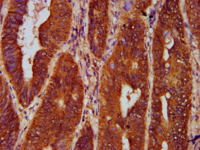 IHC image of CSB-PA009716LA01HU diluted at 1:300 and staining in paraffin-embedded human colon cancer performed on a Leica BondTM system. After dewaxing and hydration, antigen retrieval was mediated by high pressure in a citrate buffer (pH 6.0). Section was blocked with 10% normal goat serum 30min at RT. Then primary antibody (1% BSA) was incubated at 4°C overnight. The primary is detected by a biotinylated secondary antibody and visualized using an HRP conjugated SP system.