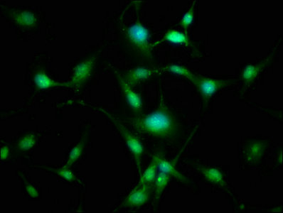 Immunofluorescence staining of U251 cells with CSB-PA736202LA01HU at 1:133, counter-stained with DAPI. The cells were fixed in 4% formaldehyde, permeabilized using 0.2% Triton X-100 and blocked in 10% normal Goat Serum. The cells were then incubated with the antibody overnight at 4°C. The secondary antibody was Alexa Fluor 488-congugated AffiniPure Goat Anti-Rabbit IgG(H+L).