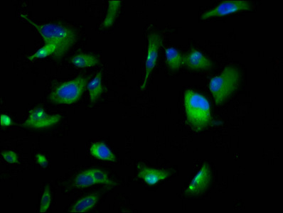 Immunofluorescence staining of U251 cells with CSB-PA735975LA01HU at 1:166, counter-stained with DAPI. The cells were fixed in 4% formaldehyde, permeabilized using 0.2% Triton X-100 and blocked in 10% normal Goat Serum. The cells were then incubated with the antibody overnight at 4°C. The secondary antibody was Alexa Fluor 488-congugated AffiniPure Goat Anti-Rabbit IgG(H+L).