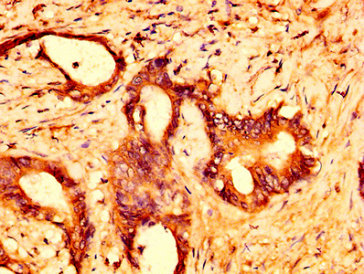 IHC image of CSB-PA735975LA01HU diluted at 1:500 and staining in paraffin-embedded human colon cancer performed on a Leica BondTM system. After dewaxing and hydration, antigen retrieval was mediated by high pressure in a citrate buffer (pH 6.0). Section was blocked with 10% normal goat serum 30min at RT. Then primary antibody (1% BSA) was incubated at 4°C overnight. The primary is detected by a biotinylated secondary antibody and visualized using an HRP conjugated SP system.