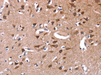 The image on the left is immunohistochemistry of paraffin-embedded Human brain tissue using CSB-PA831840(GREB1 Antibody) at dilution 1/50, on the right is treated with synthetic peptide. (Original magnification: ×200)