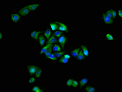 Immunofluorescence staining of Hela cells with CSB-PA009906LA01HU at 1:100, counter-stained with DAPI. The cells were fixed in 4% formaldehyde, permeabilized using 0.2% Triton X-100 and blocked in 10% normal Goat Serum. The cells were then incubated with the antibody overnight at 4°C. The secondary antibody was Alexa Fluor 488-congugated AffiniPure Goat Anti-Rabbit IgG(H+L).