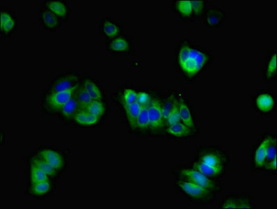 Immunofluorescent analysis of HepG2 cells using CSB-PA14129A0Rb at dilution of 1:100 and Alexa Fluor 488-congugated AffiniPure Goat Anti-Rabbit IgG(H+L)