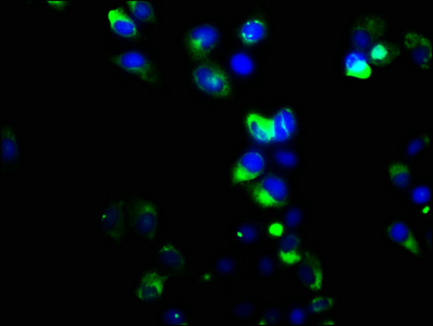 Immunofluorescence staining of Hela cells with CSB-PA009936LA01HU at 1:133, counter-stained with DAPI. The cells were fixed in 4% formaldehyde, permeabilized using 0.2% Triton X-100 and blocked in 10% normal Goat Serum. The cells were then incubated with the antibody overnight at 4°C. The secondary antibody was Alexa Fluor 488-congugated AffiniPure Goat Anti-Rabbit IgG(H+L).
