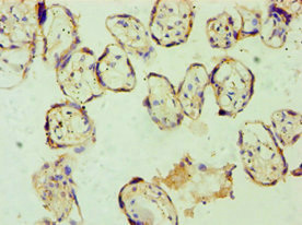 Immunohistochemistry of paraffin-embedded human placenta tissue using CSB-PA006766ESR1HU at dilution of 1:100