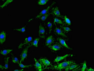Immunofluorescent analysis of Hela cells using CSB-PA009963LA01HU at dilution of 1:100 and Alexa Fluor 488-congugated AffiniPure Goat Anti-Rabbit IgG(H+L)