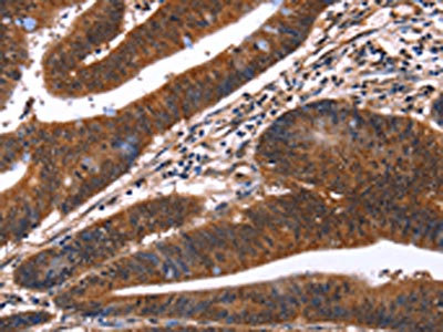The image on the left is immunohistochemistry of paraffin-embedded Human colon cancer tissue using CSB-PA223860(GUK1 Antibody) at dilution 1/40, on the right is treated with synthetic peptide. (Original magnification: ×200)