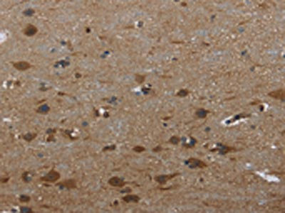 The image on the left is immunohistochemistry of paraffin-embedded Human brain tissue using CSB-PA170597(GYS1 Antibody) at dilution 1/40, on the right is treated with fusion protein. (Original magnification: ×200)