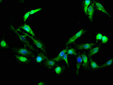 Immunofluorescence staining of Hela cells with CSB-PA010082LA01HU at 1:266, counter-stained with DAPI. The cells were fixed in 4% formaldehyde, permeabilized using 0.2% Triton X-100 and blocked in 10% normal Goat Serum. The cells were then incubated with the antibody overnight at 4°C. The secondary antibody was Alexa Fluor 488-congugated AffiniPure Goat Anti-Rabbit IgG(H+L).