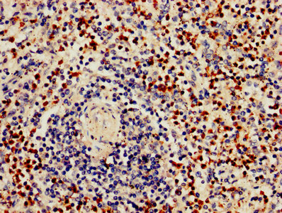 IHC image of CSB-PA010082LA01HU diluted at 1:800 and staining in paraffin-embedded human spleen tissue performed on a Leica BondTM system. After dewaxing and hydration, antigen retrieval was mediated by high pressure in a citrate buffer (pH 6.0). Section was blocked with 10% normal goat serum 30min at RT. Then primary antibody (1% BSA) was incubated at 4°C overnight. The primary is detected by a biotinylated secondary antibody and visualized using an HRP conjugated SP system.