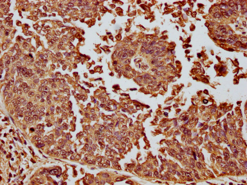 IHC image of CSB-PA010087OA11nme1HU diluted at 1:10 and staining in paraffin-embedded human cervical cancer performed on a Leica BondTM system. After dewaxing and hydration, antigen retrieval was mediated by high pressure in a citrate buffer (pH 6.0). Section was blocked with 10% normal goat serum 30min at RT. Then primary antibody (1% BSA) was incubated at 4°C overnight. The primary is detected by a biotinylated secondary antibody and visualized using an HRP conjugated SP system.
