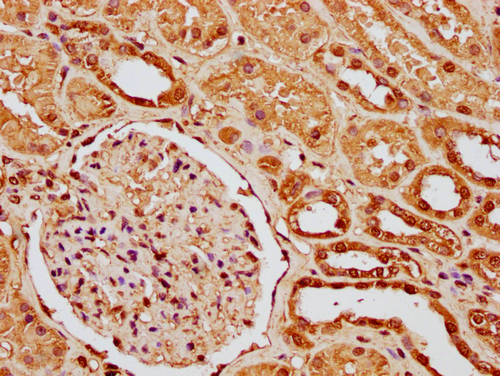 IHC image of CSB-PA010087OA11nme1HU diluted at 1:10 and staining in paraffin-embedded human kidney tissue performed on a Leica BondTM system. After dewaxing and hydration, antigen retrieval was mediated by high pressure in a citrate buffer (pH 6.0). Section was blocked with 10% normal goat serum 30min at RT. Then primary antibody (1% BSA) was incubated at 4°C overnight. The primary is detected by a biotinylated secondary antibody and visualized using an HRP conjugated SP system.