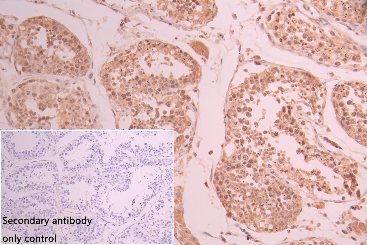 IHC image of CSB-PA010094DA01HU diluted at 1:50 and staining in paraffin-embedded human testis tissue performed on a Leica BondTM system. After dewaxing and hydration, antigen retrieval was mediated by high pressure in a citrate buffer (pH 6.0). Section was blocked with 10% normal goat serum 30min at RT. Then primary antibody (1% BSA) was incubated at 4°C overnight. The primary is detected by a Goat anti-rabbit polymer IgG labeled by HRP and visualized using 0.05% DAB. Secondary antibody only control: uses 1% BSA instead of primary antibody