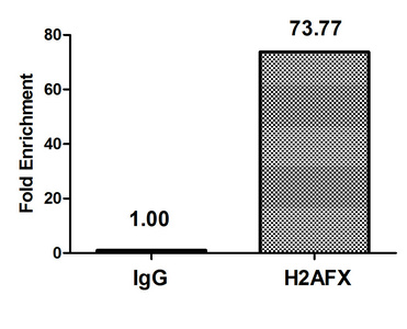 Chromatin Immunoprecipitation Hela (4*106) were treated with Micrococcal Nuclease, sonicated, and immunoprecipitated with 5µg anti-H2AFX (CSB-PA010097OA139nphHU) or a control normal rabbit IgG. The resulting ChIP DNA was quantified using real-time PCR with primers against the β-Globin promoter.