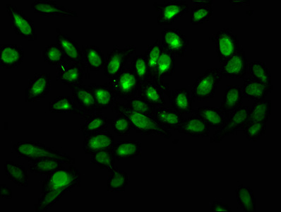 Immunofluorescence staining of Hela cells with CSB-PA010097OA139nphHU at 1:2.5, counter-stained with DAPI. The cells were fixed in 4% formaldehyde, permeabilized using 0.2% Triton X-100 and blocked in 10% normal Goat Serum. The cells were then incubated with the antibody overnight at 4°C. The secondary antibody was Alexa Fluor 488-congugated AffiniPure Goat Anti-Rabbit IgG(H+L).