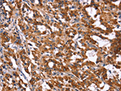 The image on the left is immunohistochemistry of paraffin-embedded Human gastric cancer tissue using CSB-PA784614(HACE1 Antibody) at dilution 1/40, on the right is treated with synthetic peptide. (Original magnification: ×200)