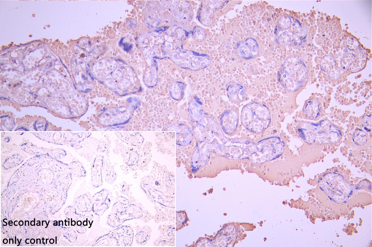 IHC?image?of?CSB-PA010150LA01HU?diluted?at?1:100?and?staining?in?paraffin-embedded?human?placenta?tissue?performed?on?a?Leica?BondTM?system.?After?dewaxing?and?hydration,?antigen?retrieval?was?mediated?by?high?pressure?in?a?citrate?buffer?(pH?6.0).?Section?was?blocked?with?10%?normal?goat?serum?30min?at?RT.?Then?primary?antibody?(1%?BSA)?was?incubated?at?4°C?overnight.?The?primary?is?detected?by?a?Goat?anti-rabbit?polymer?IgG?labeled?by?HRP?and?visualized?using?0.05%?DAB. Secondary?antibody?only?control: uses 1%?BSA instead of primary antibody
