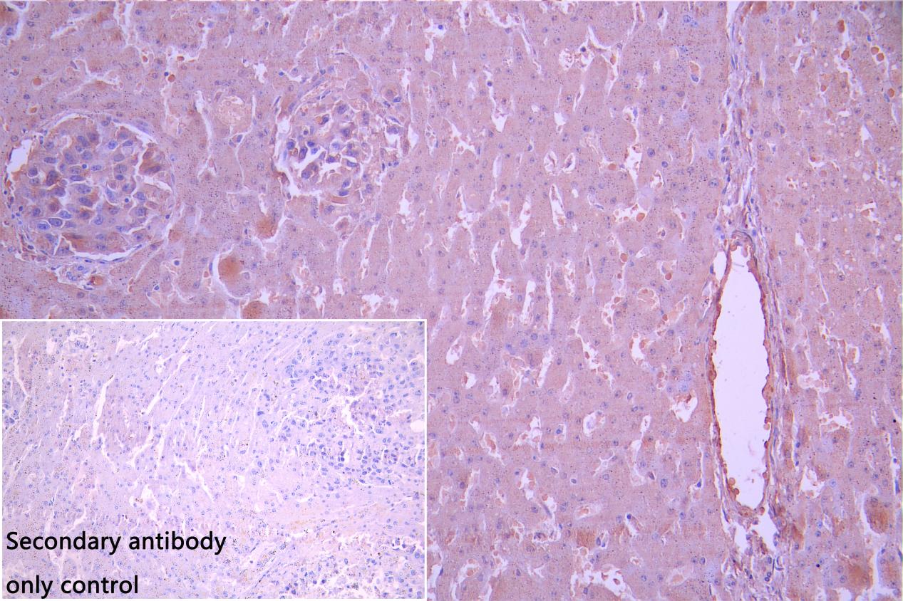 IHC?image?of?CSB-PA010150LA01HU?diluted?at?1:100?and?staining?in?paraffin-embedded?human?Liver?cancer?performed?on?a?Leica?BondTM?system.?After?dewaxing?and?hydration,?antigen?retrieval?was?mediated?by?high?pressure?in?a?citrate?buffer?(pH?6.0).?Section?was?blocked?with?10%?normal?goat?serum?30min?at?RT.?Then?primary?antibody?(1%?BSA)?was?incubated?at?4°C?overnight.?The?primary?is?detected?by?a?Goat?anti-rabbit?polymer?IgG?labeled?by?HRP?and?visualized?using?0.05%?DAB. Secondary?antibody?only?control: uses 1%?BSA instead of primary antibody