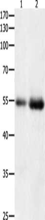 Gel: 10%SDS-PAGE, Lysate: 40 μg, Lane 1-2: Human colon tissue, Human kidney cancer tissue, Primary antibody: CSB-PA278920(HDAC1 Antibody) at dilution 1/400, Secondary antibody: Goat anti rabbit IgG at 1/8000 dilution, Exposure time: 2 minutes